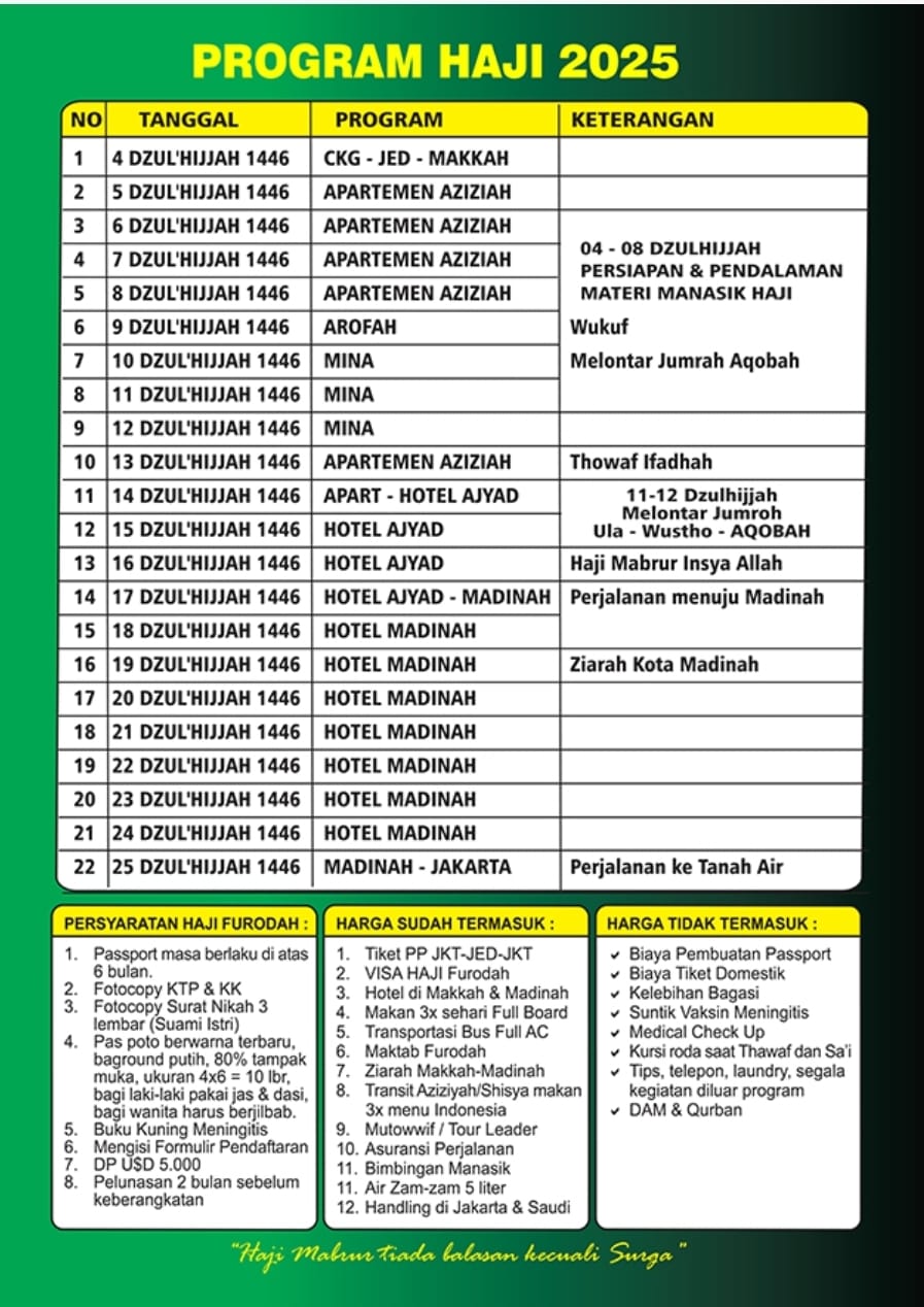 Kesempatan untuk menunaikan ibadah haji di tahun 2025 tanpa harus menunggu antrean kini ada di depan mata. Jangan tunda lagi! Segera daftarkan diri Anda dan keluarga dalam Paket Haji Furodah Ekonomis Arba’in Ramah Lansia dari Salma Tour.